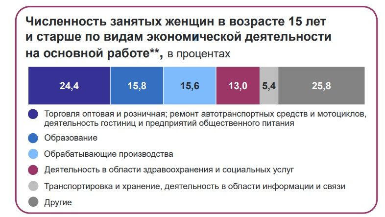 Если говорить о том, где и кем работают женщины, то согласно статистике, 24,4% заняты в торговле, 15,8% – в сфере образования, и чуть меньше – 15,6% – в обрабатывающем производстве. При этом 30,3% всех женщин старше 15 лет имеют высший уровень квалификации.