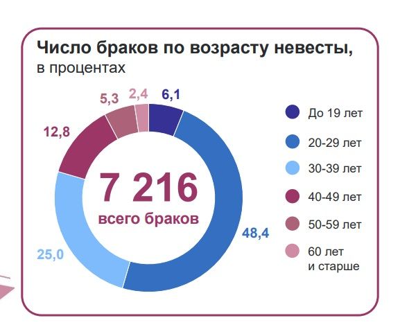 Что касается семейного положения, то по данным на 1 января 2024 года в Пензенской области зарегистрировано 7216 браков. Большая часть женщин – 48,4% – вышли замуж в возрасте 20-29 лет, чуть меньше – 25% – в 30-39 лет.