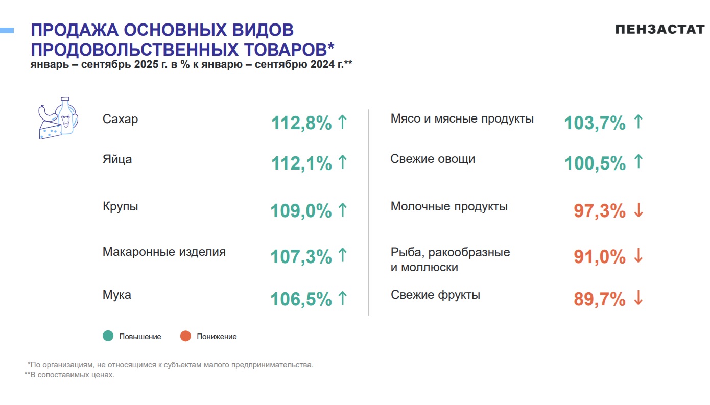 Оборот торговли продуктами составил 140,7 млрд рублей, увеличившись на 0,9%. Наиболее значительный рост продемонстрировали товары первой необходимости. По данным Пензастата, продажи через крупные и средние предприятия выросли: сахара — на 12,8%, яиц — на 12,1%, круп — на 9%, макаронных изделий — на 7,3%, муки — на 6,5%.