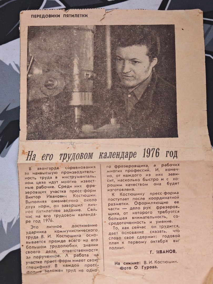 О его ответственности, усердии и трудолюбии писали газеты: «Выполняя ежемесячно около двух норм, он завершил личное пятилетнее задание. (…) Это личное достижение ударника коммунистического труда В. И. Костюшина основывается, прежде всего, на его трудолюбии, знании своего дела, ответственности за порученное».