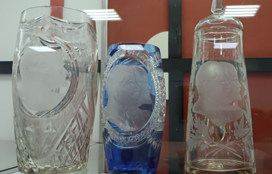 Нужно упомянуть также изделия, которые изготавливали к юбилеям Сталина. По эскизам Мухиной произвели хрустальный стол для вождя. Позднее для него сделали огромные вазы из хрусталя и крюшонницы с 12 бокалами. Изделия производили в двух экземплярах – первый отправили юбиляру, а второй можно увидеть в никольском музее.
