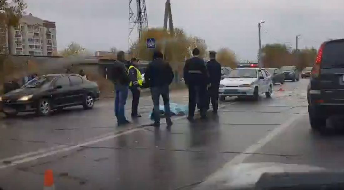 На кадрах виден автомобиль с сильно поврежденным лобовым стеклом, а также люди, в том числе сотрудники полиции, стоящие вокруг накрытого тела погибшего. На дороге валяется обувь пенсионера, а также боковое зеркало отечественного автомобиля.