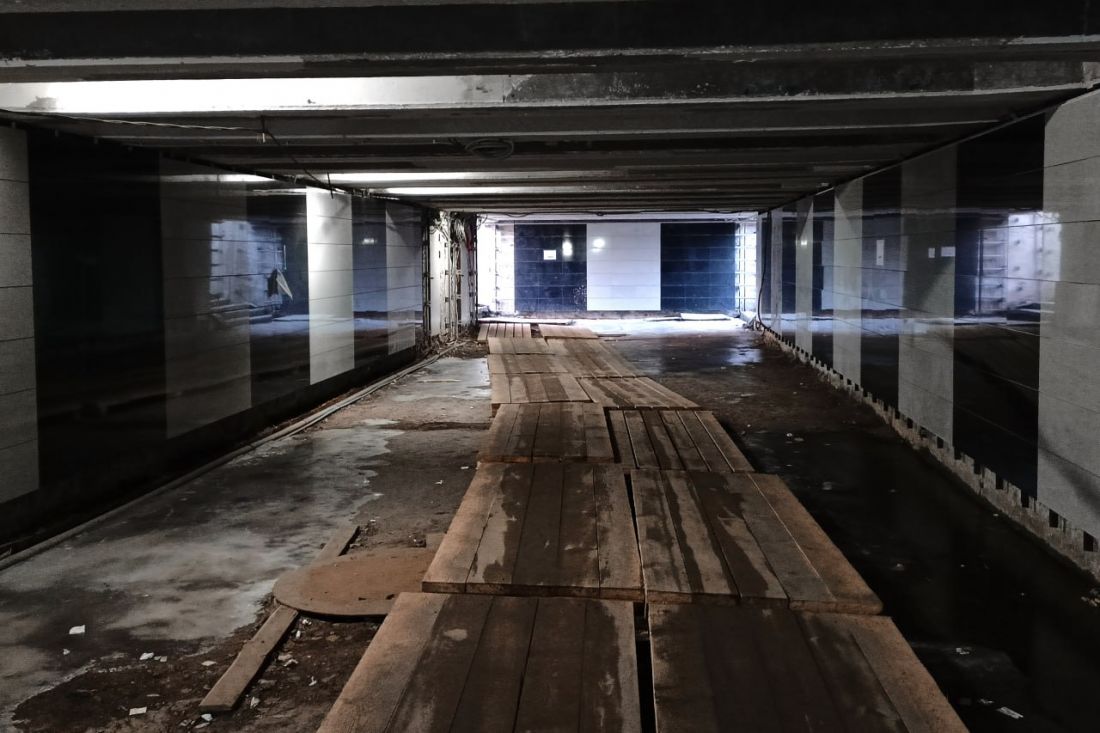 Ремонт в подземном переходе ведется достаточно давно, с 2023 года. Говорили о появлении внутренних вод, смене подрядчика. В результате работы остановились. Чтобы пройти по переходу, приходилось перепрыгивать лужи с помощь постеленных поддонов.