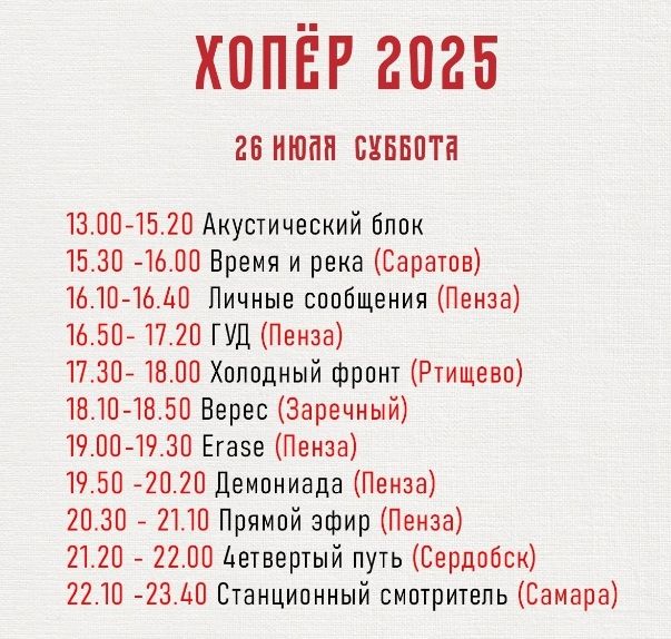 Фестиваль будут проходить два дня, 25 и 26 июля. В пятницу он начнется в 8 часов вечера, в субботу – в час дня. Ожидаются исполнители из Пензы, Сердобска, Самары, Саратова, Кирова, Заречного.