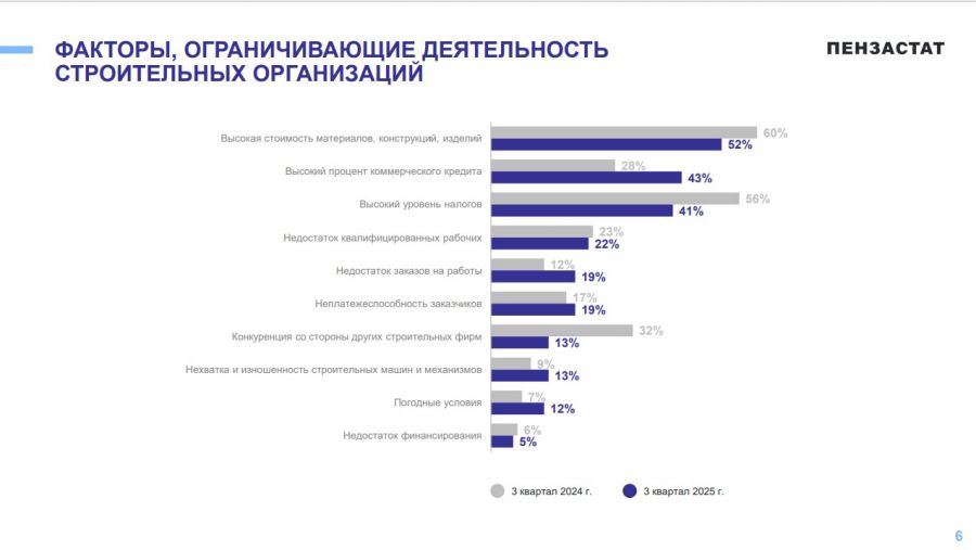 Результаты опроса строительных организаций выявили ряд системных проблем. Согласно исследованию, 52% строительных организаций отмечают высокую стоимость материалов как основное ограничение развитие отрасли, 56% указывают на нехватку квалифицированных кадров. За год вдвое выросла доля компатий, жалующихся на удорожание кредитов — с 23% до 41%. Налоговую нагрузку проблемой назвали 32% застройщиков.