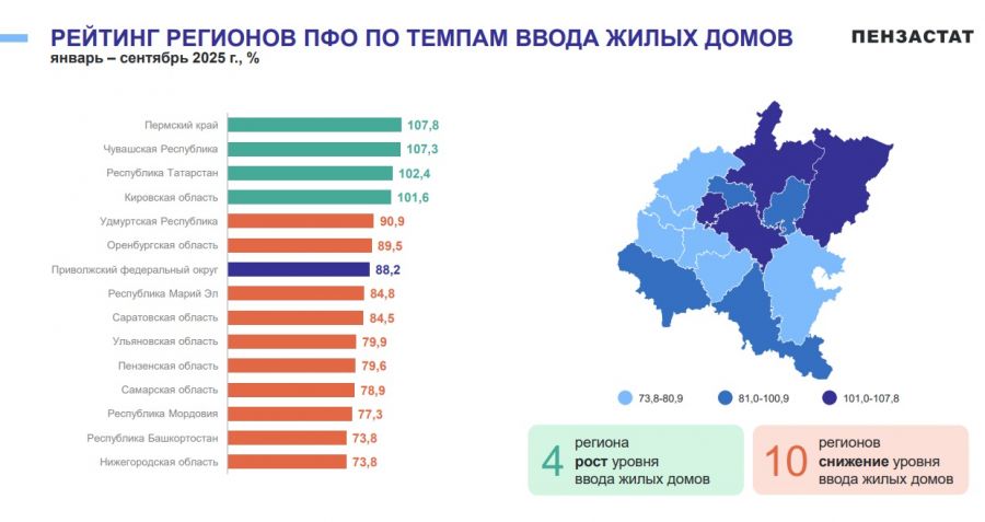 Показательно, что регионы-лидеры по вводу жилья в ПФО — Пермский край (107,8 %) и Чувашская Республика (107,3 %) — одновременно демонстрируют и высокие темпы строительства в целом. Это позволяет предположить, что в Пензенской области наблюдается устойчивый дисбаланс между объемами начатого и завершенного строительства.