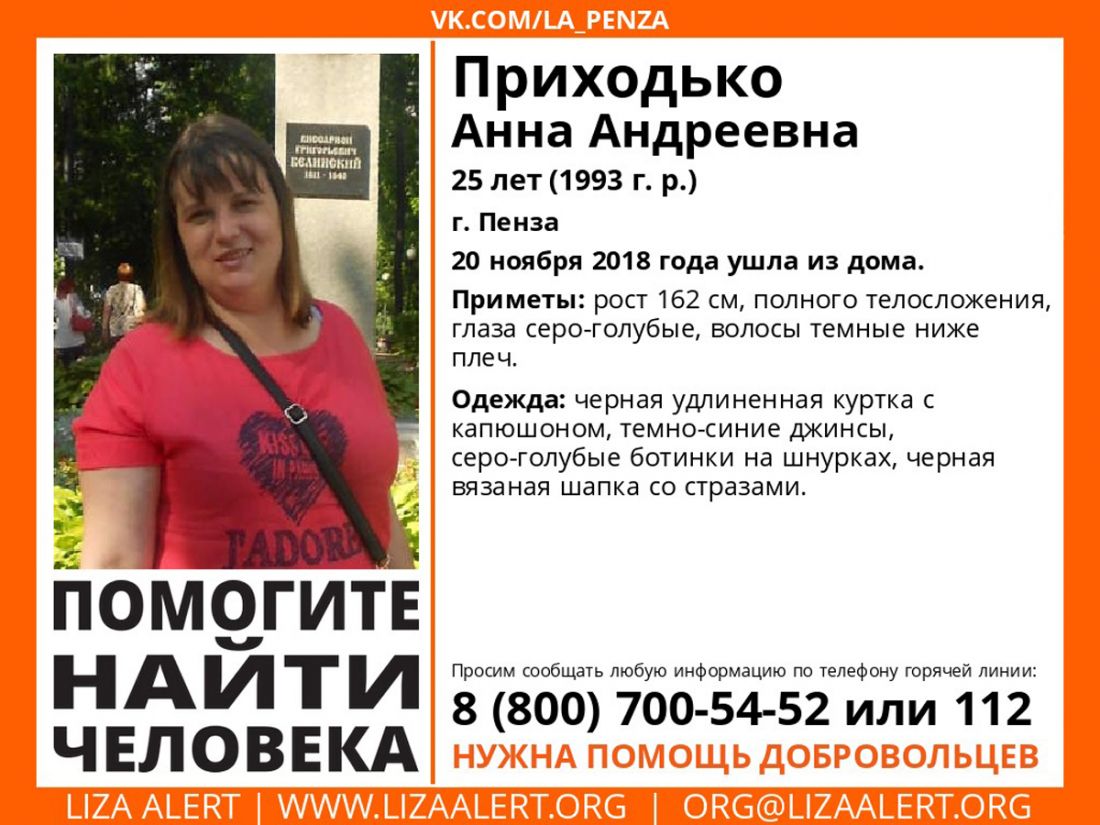 Волонтеры просят всех, кто может, помочь в поисках пропавшей Анны Андреевны Приходько. По их данным, молодая женщина ростом 162 сантиметра, плотного телосложения, черные волосы ниже плеч. Была одета в черную удлиненную куртку с капюшоном, темно-синие джинсы, серо-голубые ботинки на шнурках и черную вязаную шапку со стразами. Также у пензячки с собой сумка темно-коричневого цвета.