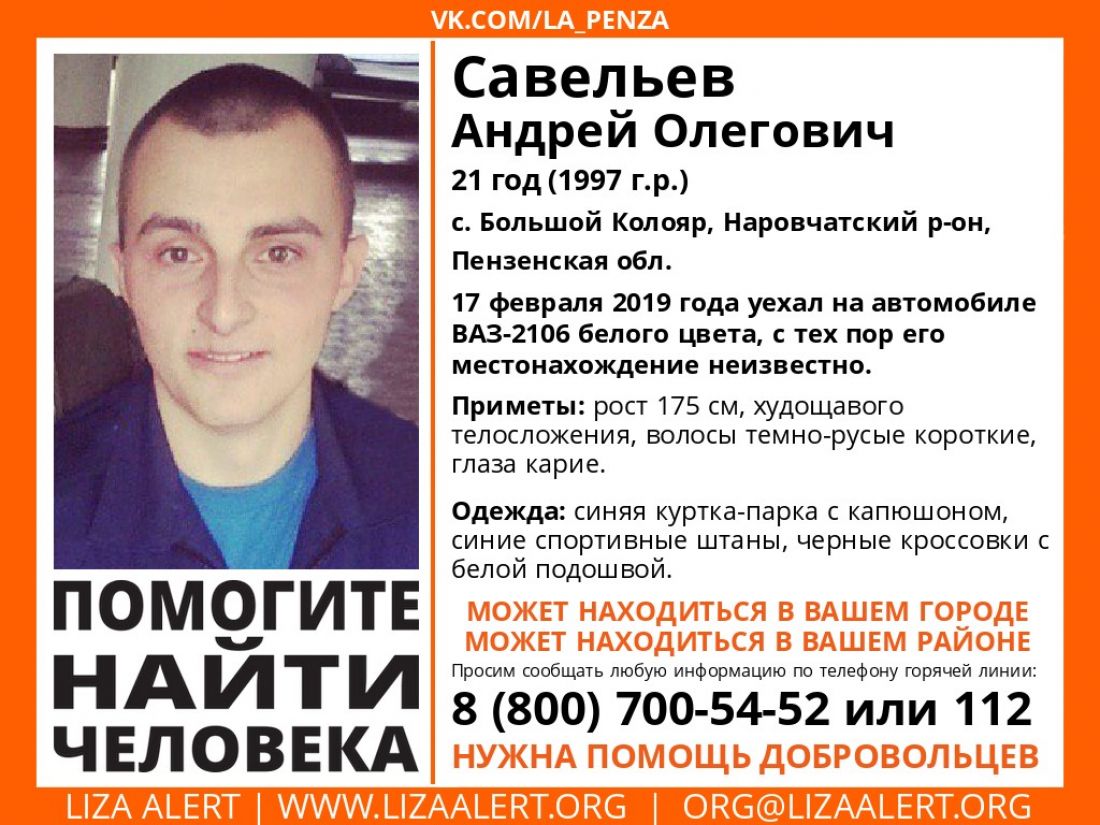 В официальной группе поискового отряда размещено сообщение о том, что с уже более десяти дней родные и близкие не имеют никакой информации о 21-летнем Андрее Олеговиче Савельеве, который живет в селе Большой Колояр Наровчатского района Пензенской области.