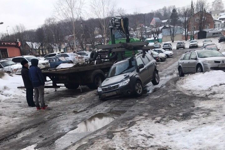 Вызволять машину из асфальтового плена приехал эвакуатор.