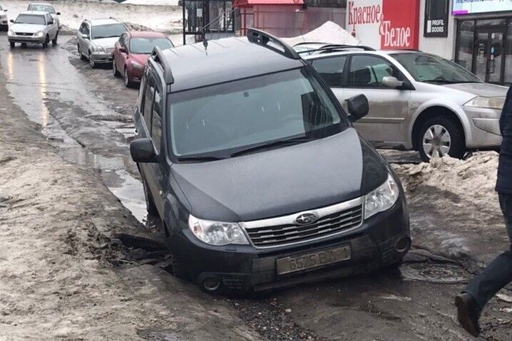 Застрявший в яме Subaru опечалил пользователей Сети.