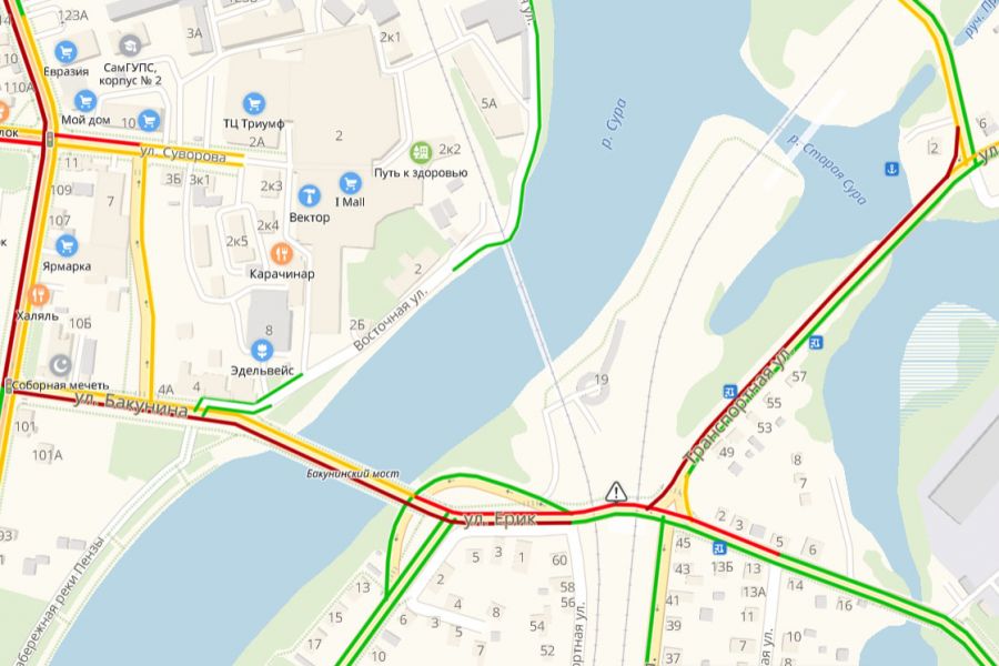 На место происшествия уже прибыли сотрудники ДПС. Дорожная обстановка в этом районе сильно осложнена. От улицы Бакунина до моста машины двигаются на скорости максимум три километра в час, улица Транспортная стоит от пересечения с улицей Свободы до улицы Ерик.