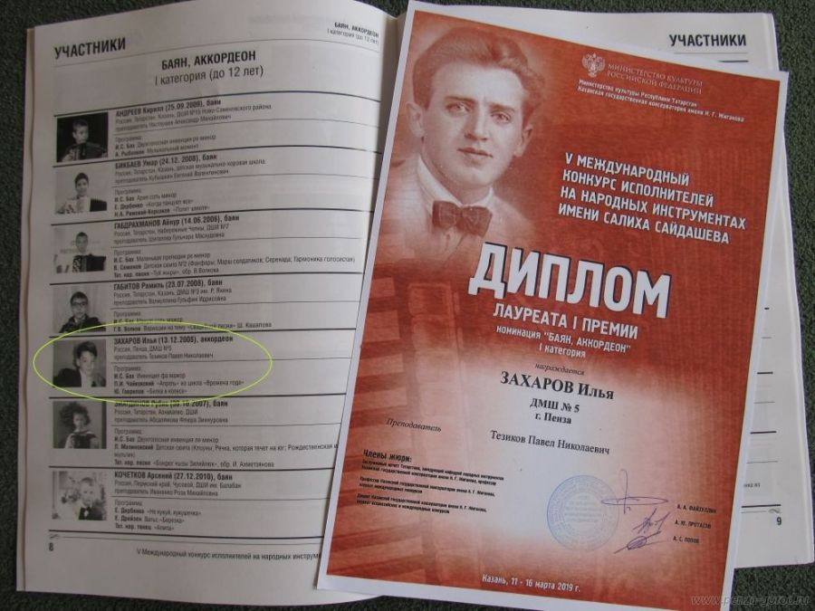 Ученик детской музыкальной школы №5 Илья Захаров успешно выступил на V Международном конкурсе исполнителей на народных инструментах имени Салиха Сайдашева, который проходил в марте в Казанской консерватории. Учащийся четвертого класса покорил членов жюри владением аккордеона и стал лауреатом I степени.