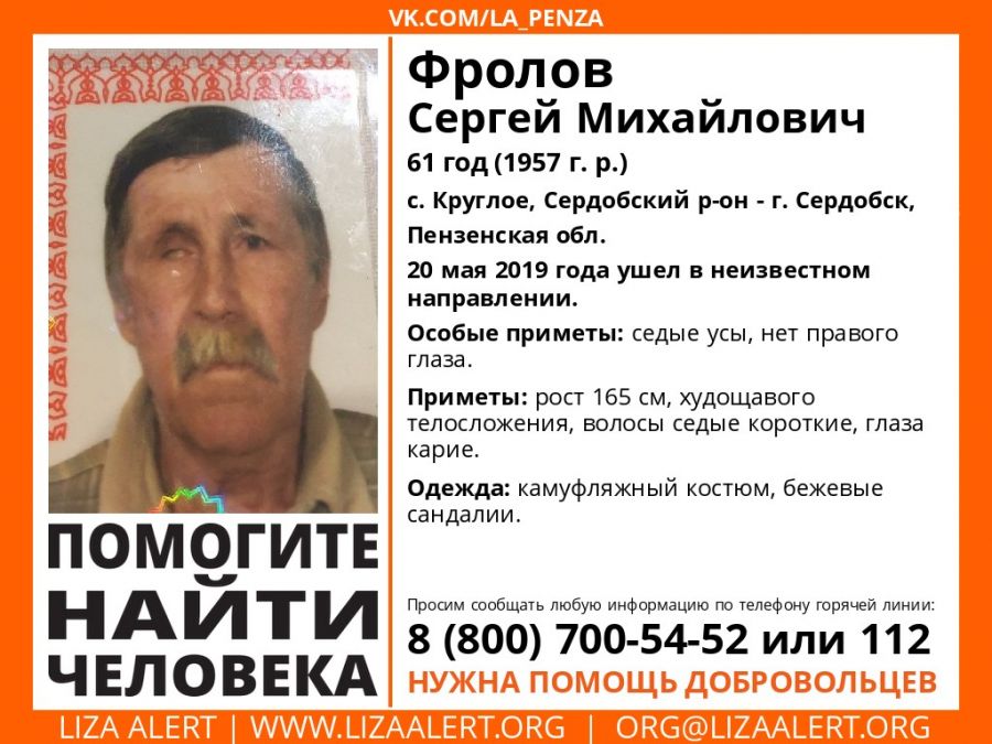 В официальном сообществе пензенских поисковиков «Лиза Алерт» социальной сети «ВКонтакте» опубликована ориентировка на пропавшего 61-летнего Фролова Сергея Михайловича. Он ушел 20 мая в неизвестном направлении и до настоящего момента его местонахождение неизвестно.