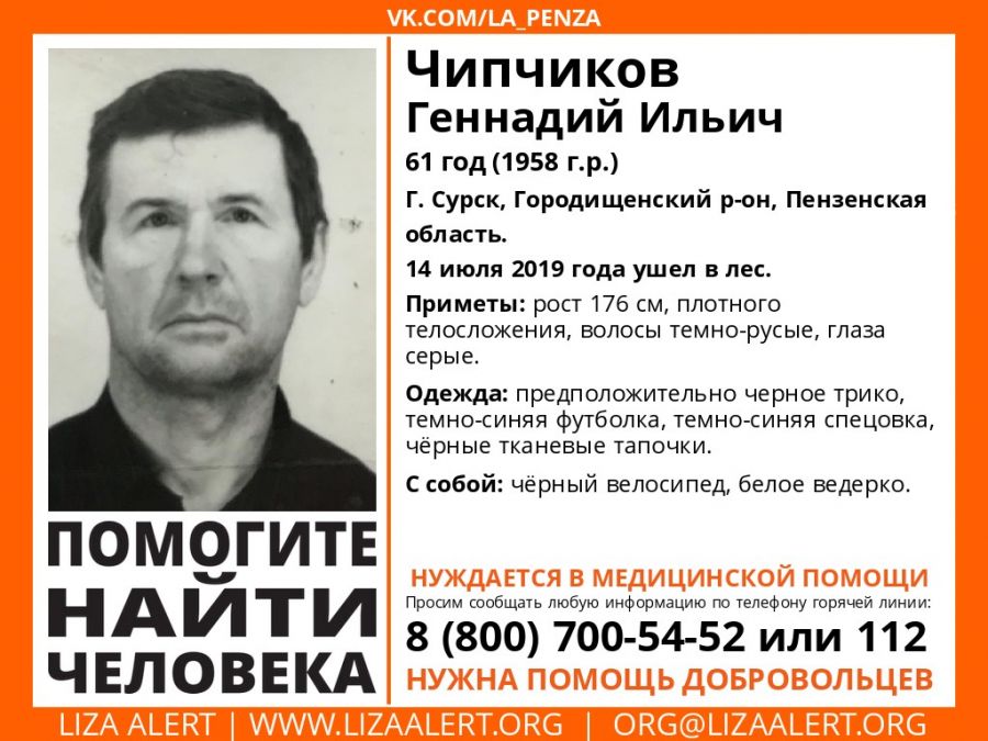 Вечером в понедельник, 15 июля, в группе «Лиза Алерт Пенза» объявили о выезде на поиски 61-летнего Геннадия Ильича Чипчикова. Житель Сурска Городищенского района ушел в лес 14 июля, домой мужчина не вернулся.