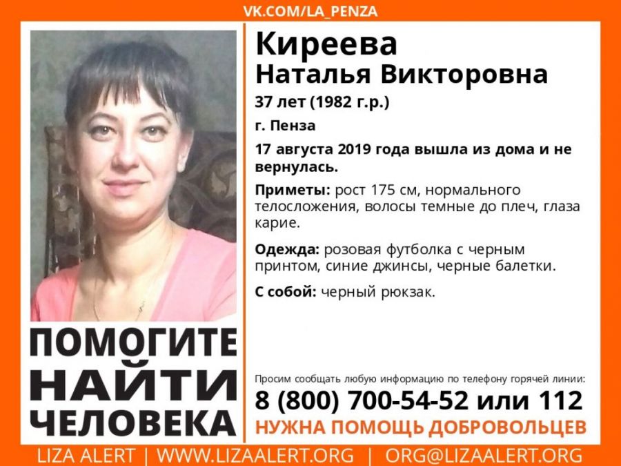 Как рассказали представители поискового отряда Лиза-Алерт, 37-летняя Наталья Киреева покинула свой дом 17 августа 2019 года и с тех пор о ее местонахождении ничего неизвестно.