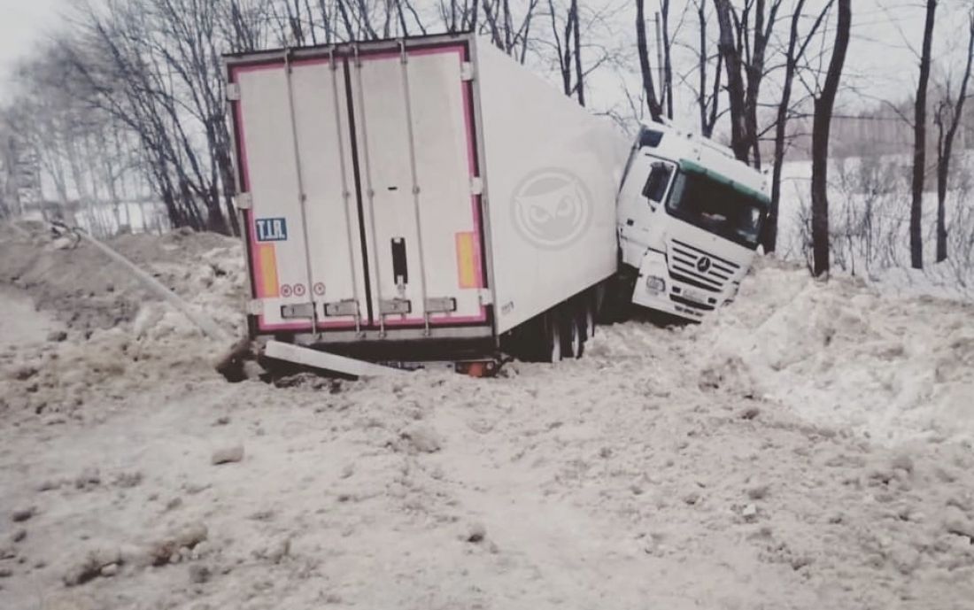 «Городище. Время 07:20», - написал автор поста. На фото видно, что грузовик вылетел с проезжей части и оказался в снежном заносе.